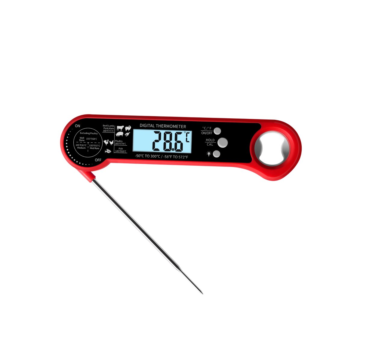 This kitchen thermometer has a backlit LCD display that clearly shows the current temperature of what you're cooking. The thermometer also turns on automatically when the measuring stick is folded out, and then turns off when you fold it back in. If the thermometer is left unused for more than 10 minutes? Of course, it also turns off automatically to save battery power. Once you use the thermometer, you can read the measurement result within four seconds, and there's even an integrated bottle opener on the handle.
