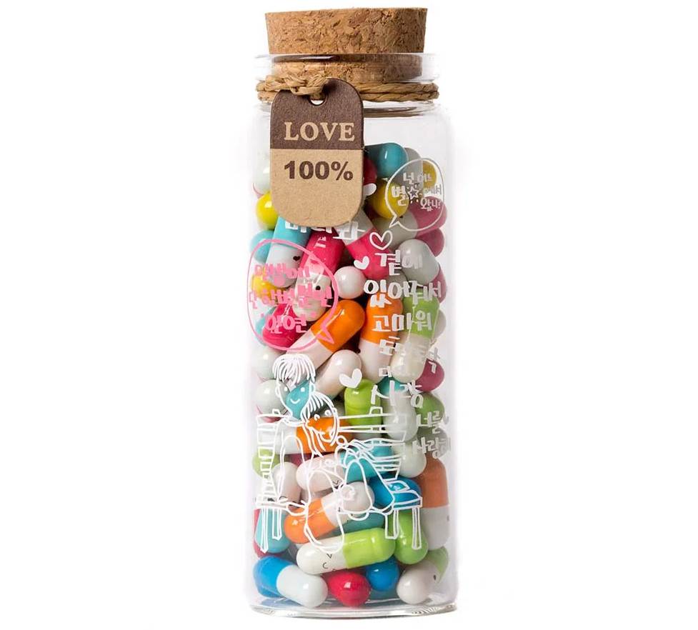 With the Love Pills you can conquer the heart of the one you love without getting a cramp or possibly being poisoned. The pot contains 90 coloured capsules with a note that's just big enough to write a brief note to express your feelings. This message is a romantic gesture that will immediately put your loved one into a daze of infatuation. Just put the pill next to his/her fruit juice at breakfast, or put it on his/her pillow at night. Don't forget to mention that the pill mustn't be swallowed!