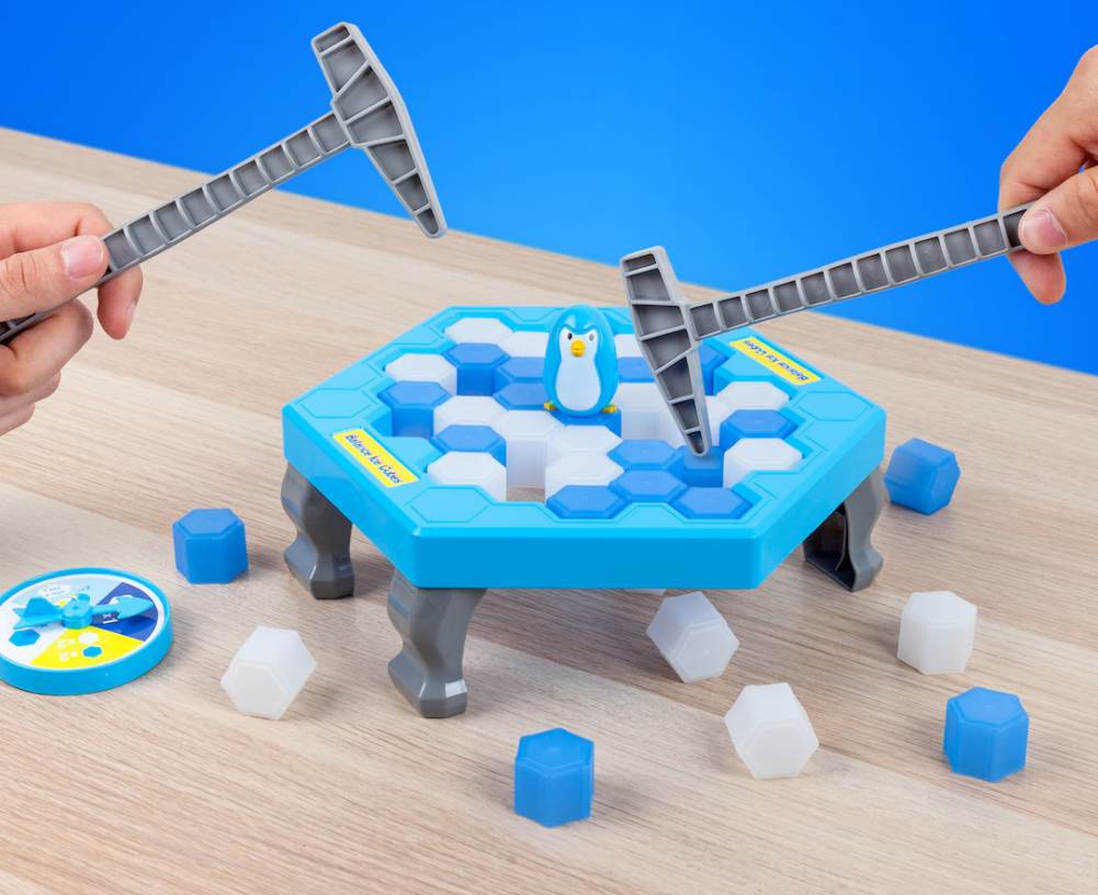 The rules are childishly simple: the players take turns knocking off ice floes with their ice picks. A spin determines whether it is white or blue ice floes that are to be chipped off, but be careful! The ice is thin and voila! you have accidentally chipped off the ice floe that the penguin is balancing on! The player who knocks off that last ice floe that makes the penguin take an involuntary bath has lost!