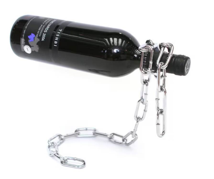 Wine racks often try to be so remarkable when in fact they are just shelves that wine bottles fit into. That is why it is our great pleasure to offer a wine rack that is actually quite remarkable: the Chain Wine Rack. Not only is it, as the name suggests, a chain. It also gives the illusion that your wine bottle is striving somewhere (towards your throat?) by nullifying the old, honorable law of gravity when the chain holds your bottle. A nice gift for the wine-loving hard rocker (they like chains) or the amateur magician (they like illusions).